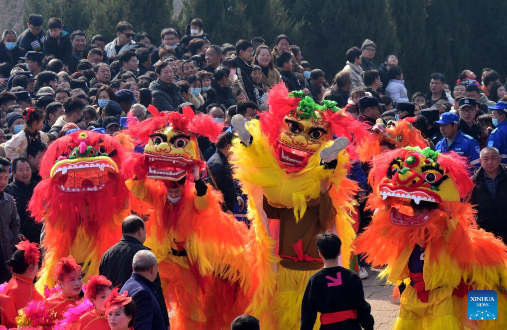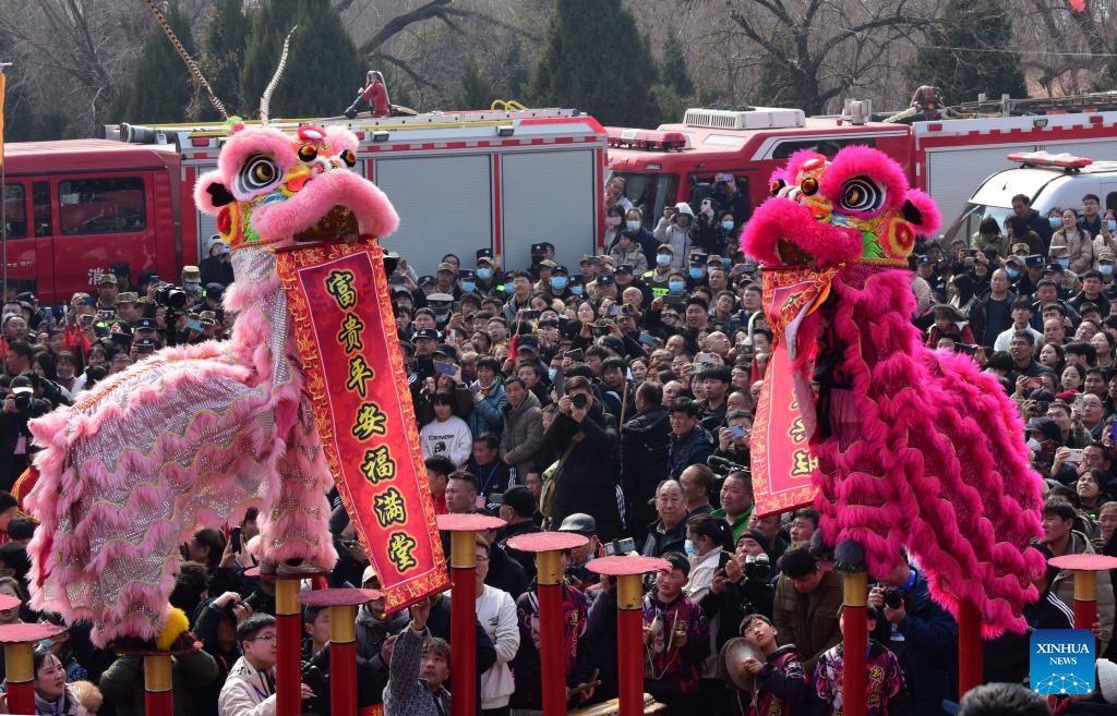 Folk artists perform lion dance during a temple fair held in Xunxian County of central China's Henan Province, Feb. 25, 2024. Local residents of Shehuo performing teams participated in a temple fair in Xunxian on Sunday, one day after the Chinese Lantern Festival. Shehuo is a traditional carnival-like folk celebration, featuring performances like dragon dance, lion dance, traditional Chinese opera, drum playing and other folk performances that may vary in different regions. (Xinhua/Zhu Xiang)