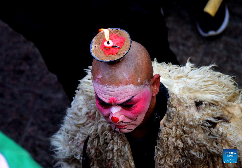 A folk artist performs during a temple fair held in Xunxian County of central China's Henan Province, Feb. 25, 2024. Local residents of Shehuo performing teams participated in a temple fair in Xunxian on Sunday, one day after the Chinese Lantern Festival. Shehuo is a traditional carnival-like folk celebration, featuring performances like dragon dance, lion dance, traditional Chinese opera, drum playing and other folk performances that may vary in different regions. (Xinhua/Zhu Xiang)