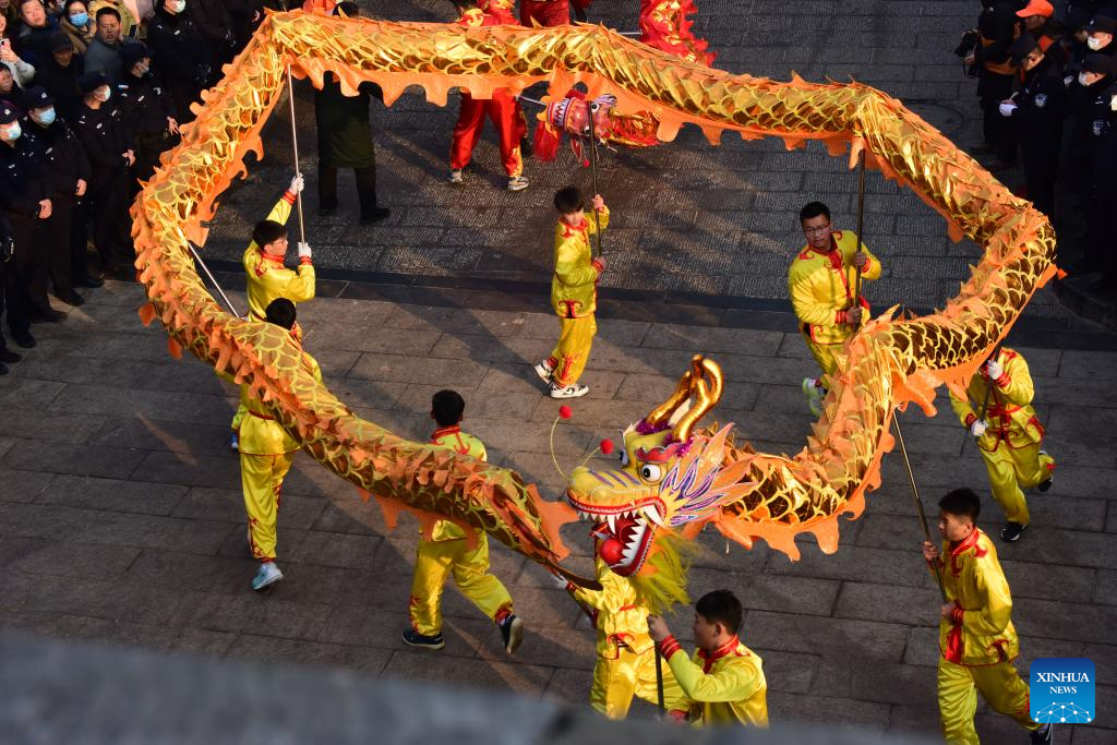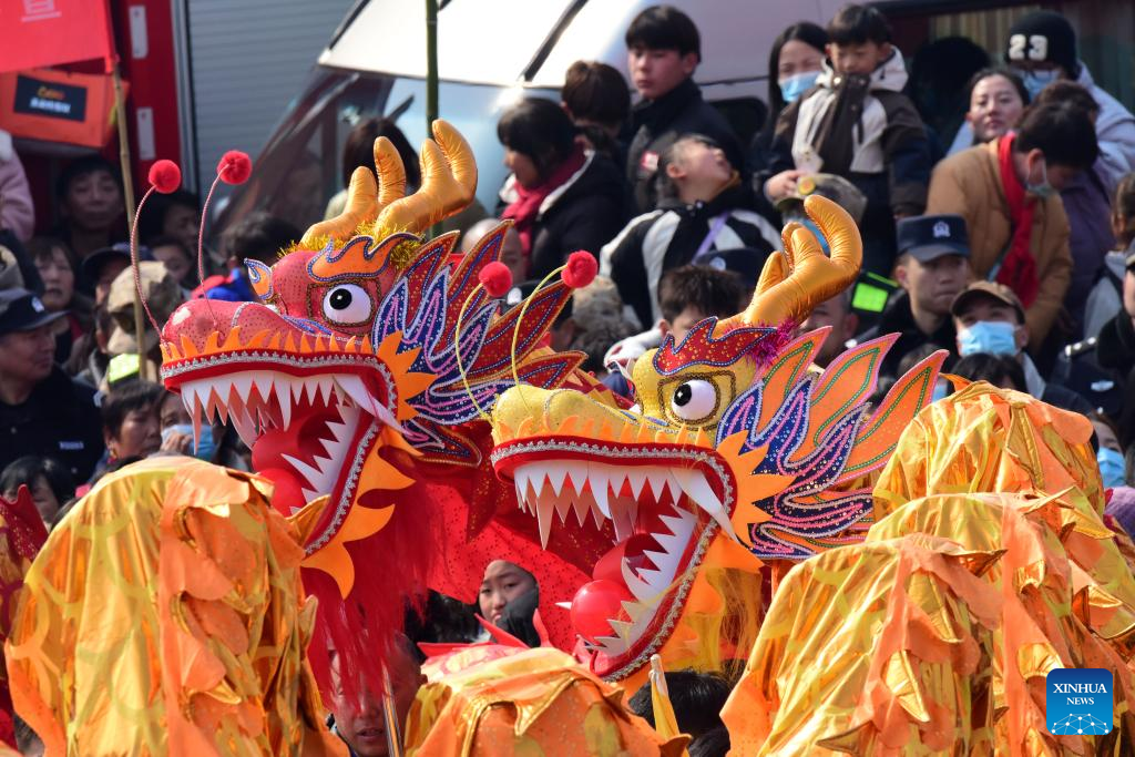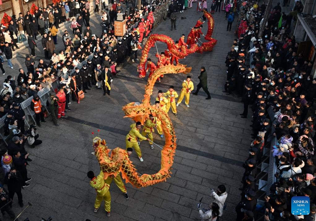Folk artists perform dragon dance during a temple fair held in Xunxian County of central China's Henan Province, Feb. 25, 2024. Local residents of Shehuo performing teams participated in a temple fair in Xunxian on Sunday, one day after the Chinese Lantern Festival. Shehuo is a traditional carnival-like folk celebration, featuring performances like dragon dance, lion dance, traditional Chinese opera, drum playing and other folk performances that may vary in different regions. (Xinhua/Zhu Xiang)