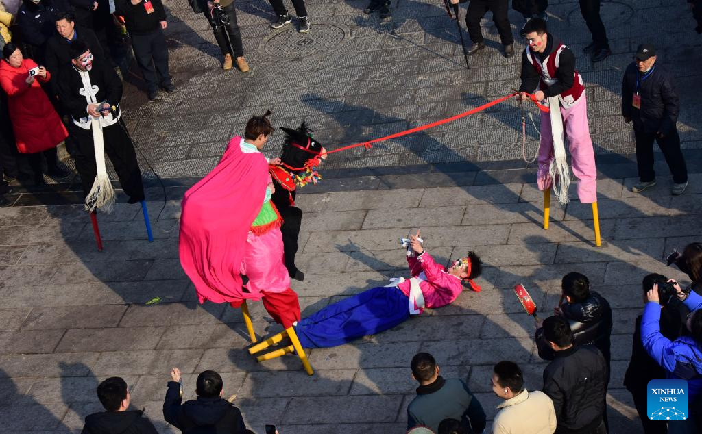 Folk artists perform a comedy show during a temple fair held in Xunxian County of central China's Henan Province, Feb. 25, 2024. Local residents of Shehuo performing teams participated in a temple fair in Xunxian on Sunday, one day after the Chinese Lantern Festival. Shehuo is a traditional carnival-like folk celebration, featuring performances like dragon dance, lion dance, traditional Chinese opera, drum playing and other folk performances that may vary in different regions. (Xinhua/Zhu Xiang)