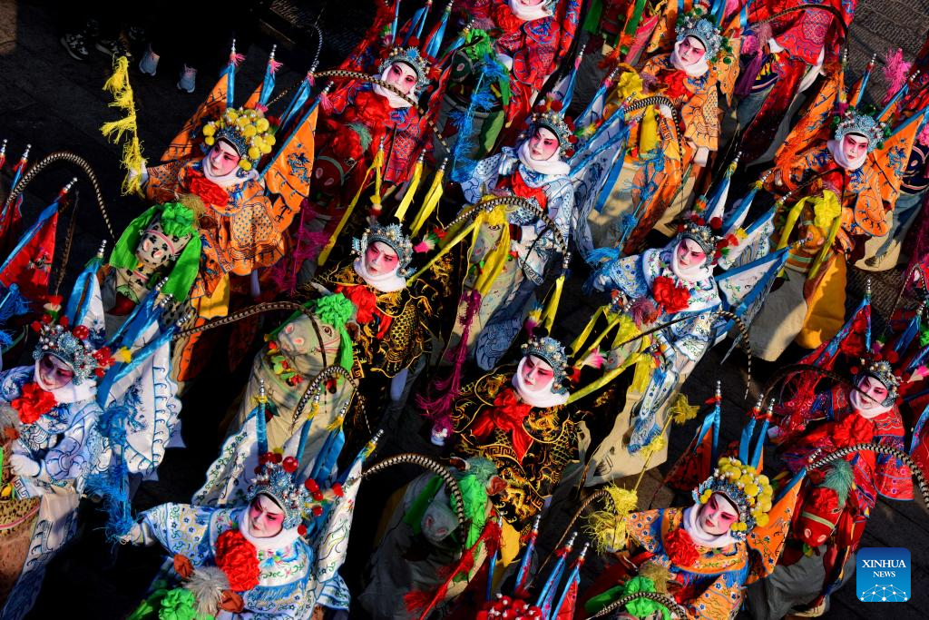 Folk artists perform during a temple fair held in Xunxian County of central China's Henan Province, Feb. 25, 2024. Local residents of Shehuo performing teams participated in a temple fair in Xunxian on Sunday, one day after the Chinese Lantern Festival. Shehuo is a traditional carnival-like folk celebration, featuring performances like dragon dance, lion dance, traditional Chinese opera, drum playing and other folk performances that may vary in different regions. (Xinhua/Zhu Xiang)