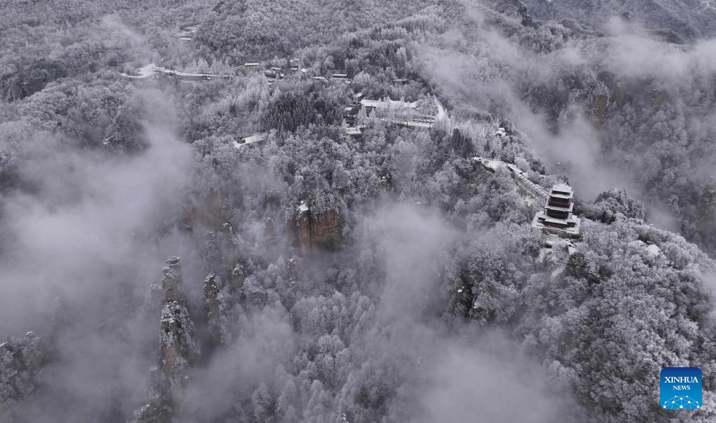 An aerial drone photo taken on Feb. 25, 2024 shows a view of the Tianzi Mountain after rain and snow at Zhangjiajie National Forest Park in central China's Hunan Province. (Photo by Wu Yongbing/Xinhua)
