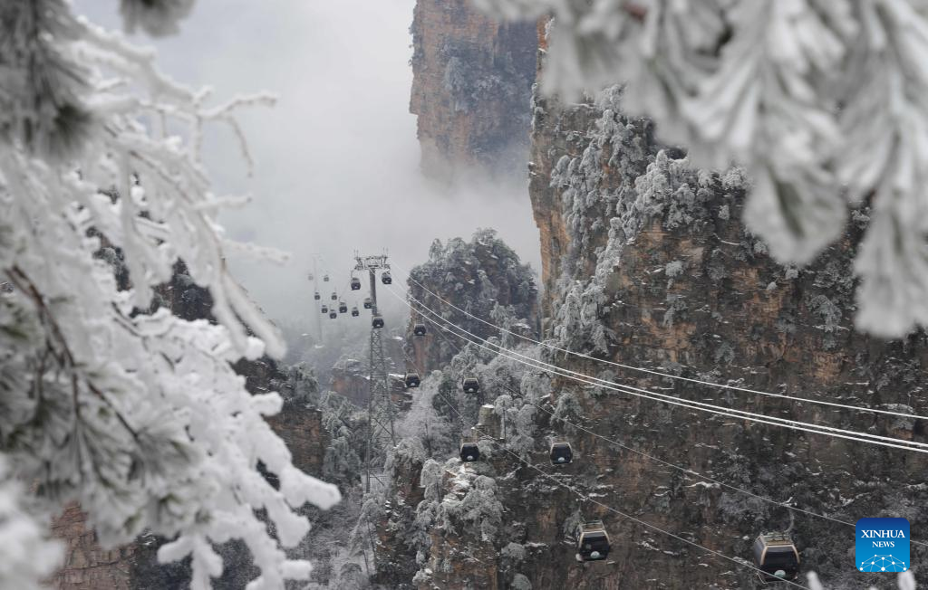 This photo taken on Feb. 25, 2024 shows cable cars running at the Tianzi Mountain after rain and snow at Zhangjiajie National Forest Park in central China's Hunan Province. (Photo by Wu Yongbing/Xinhua)