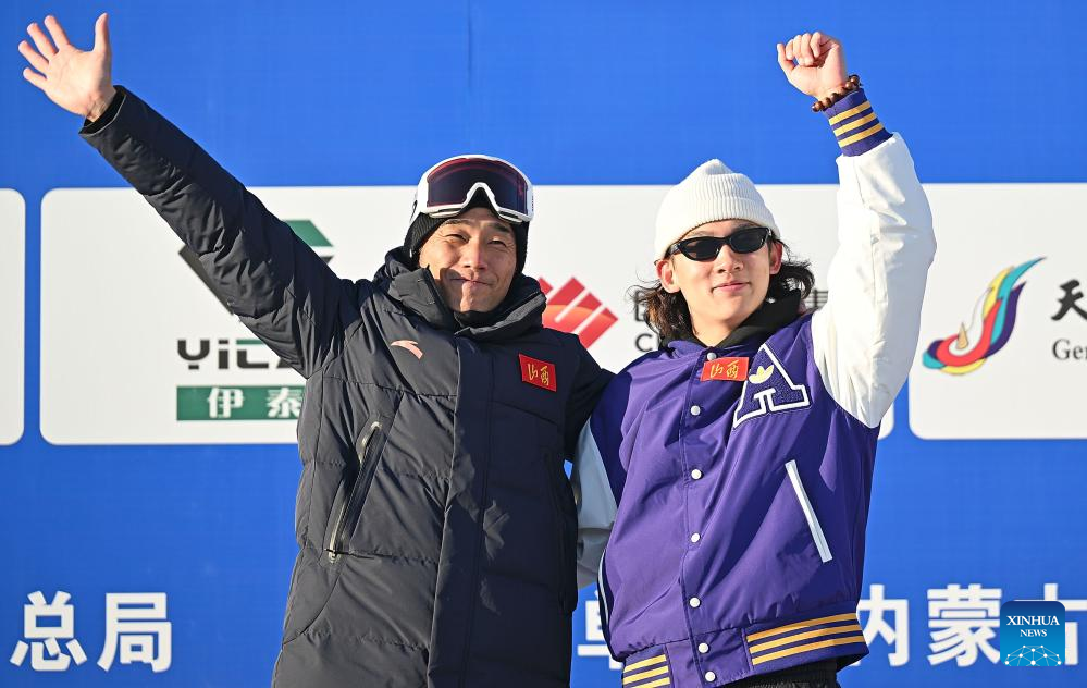 Gold medalist Su Yiming (R) of Shanxi celebrates with his Japanese coach Sato Yasuhiro during the awarding ceremony of the men's snowboard slopestyle at the 14th National Winter Games in Hulun Buir, north China's Inner Mongolia Autonomous Region, Feb. 24, 2024. (Xinhua/Bei He)