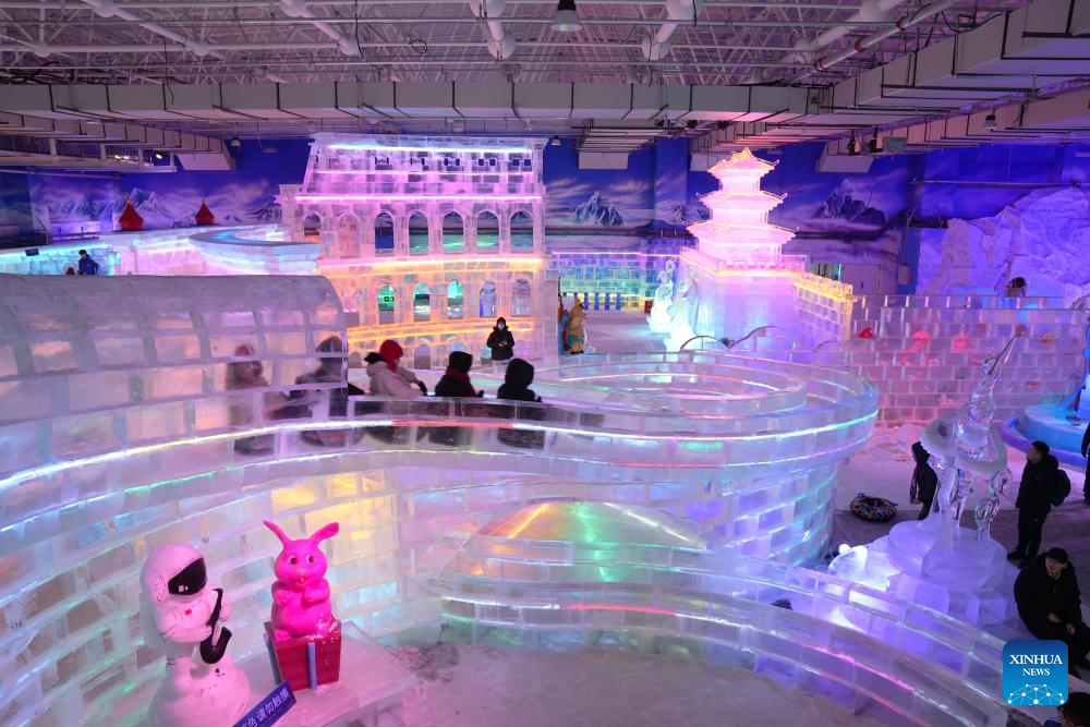 Tourists have fun at an ice and snow art gallery of the Sun Island scenic spot in Harbin, northeast China's Heilongjiang Province, Feb. 23, 2024. Covering an area of nearly 5,000 square meters, this indoor ice and snow art gallery wowed tourists with ice sculptures and various ice and snow entertainment. (Xinhua/Wang Jianwei)
