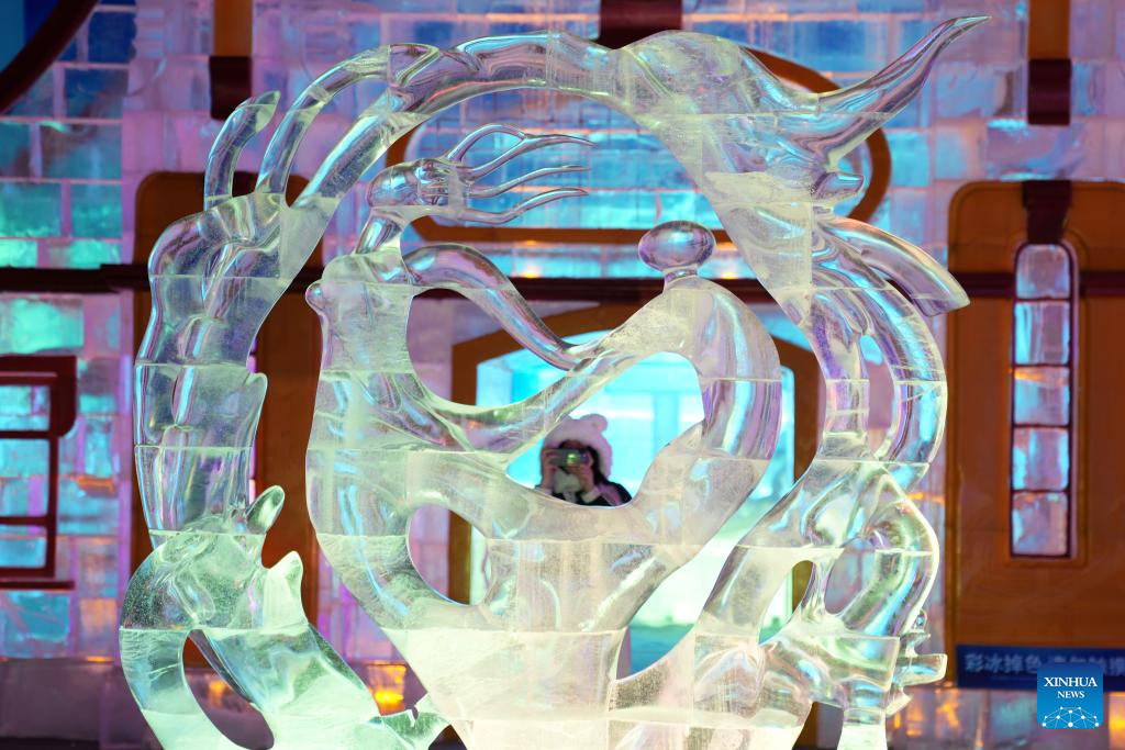A tourist takes photo of an ice sculpture at an ice and snow art gallery of the Sun Island scenic spot in Harbin, northeast China's Heilongjiang Province, Feb. 23, 2024. Covering an area of nearly 5,000 square meters, this indoor ice and snow art gallery wowed tourists with ice sculptures and various ice and snow entertainment. (Xinhua/Wang Jianwei)