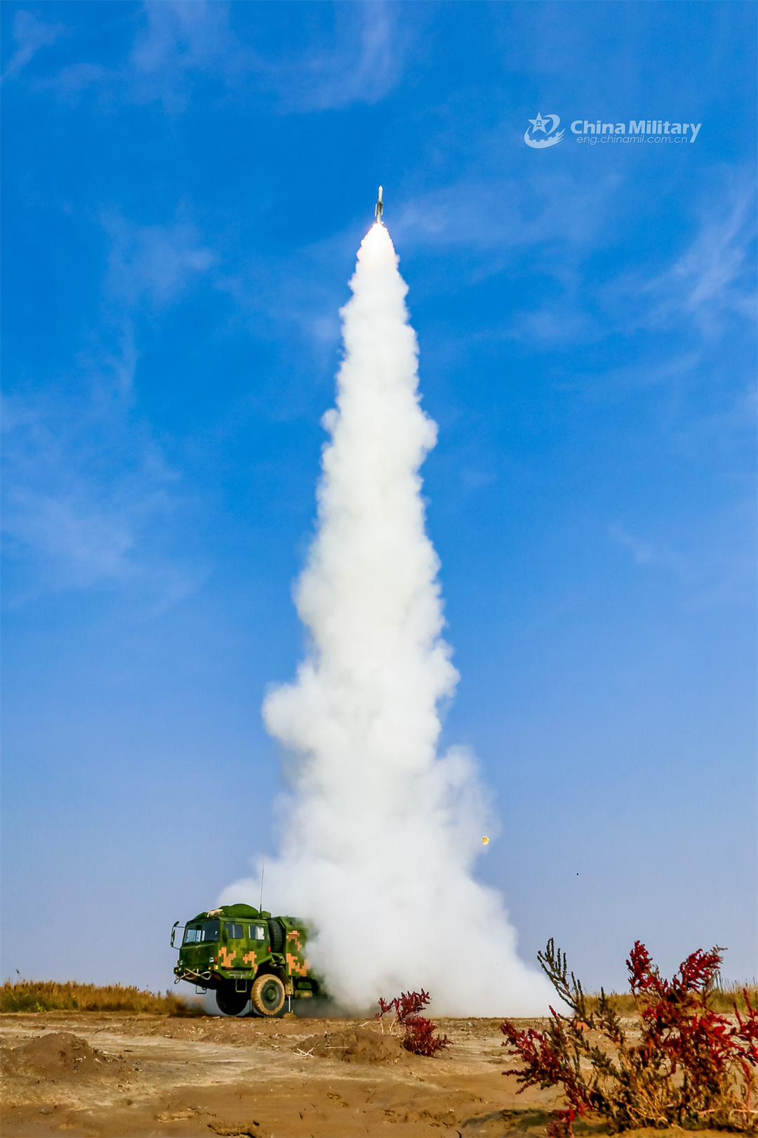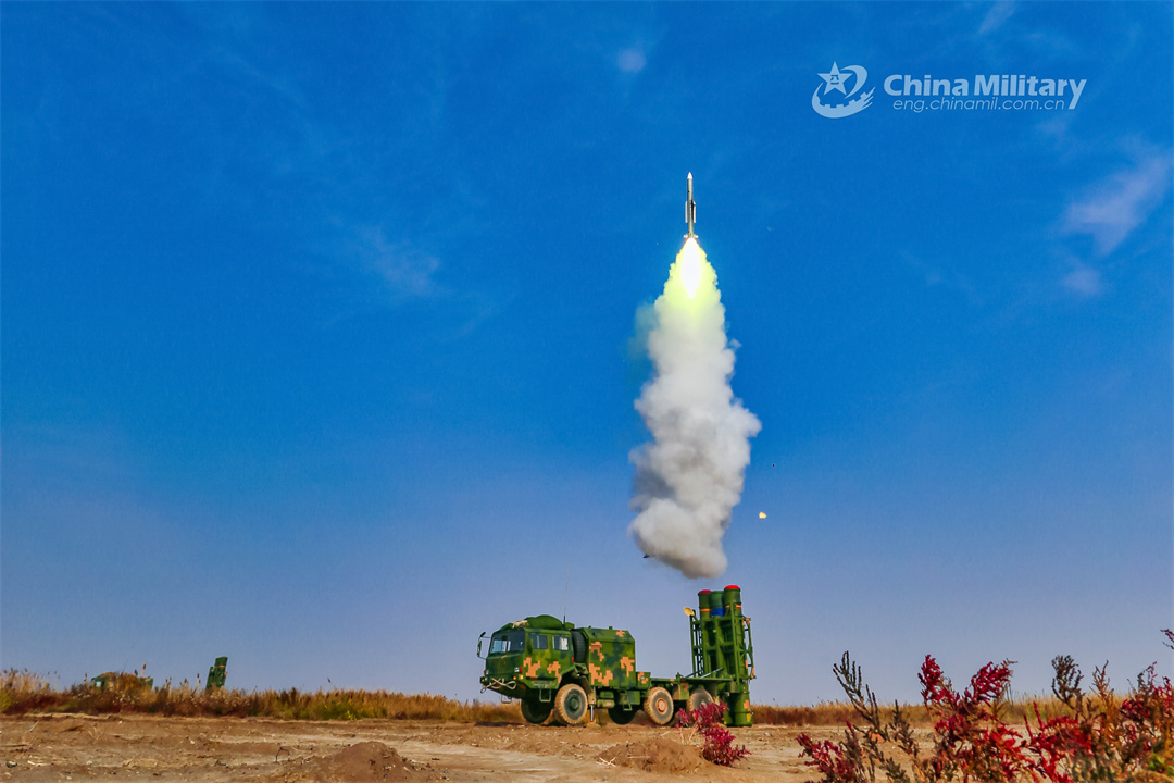 An air defense missile system attached to a brigade under the PLA 71st Group Army fires at the mock target during a live-fire confrontation exercise on February 15, 2024. (eng.chinamil.com.cn/Photo by Tang Tian)