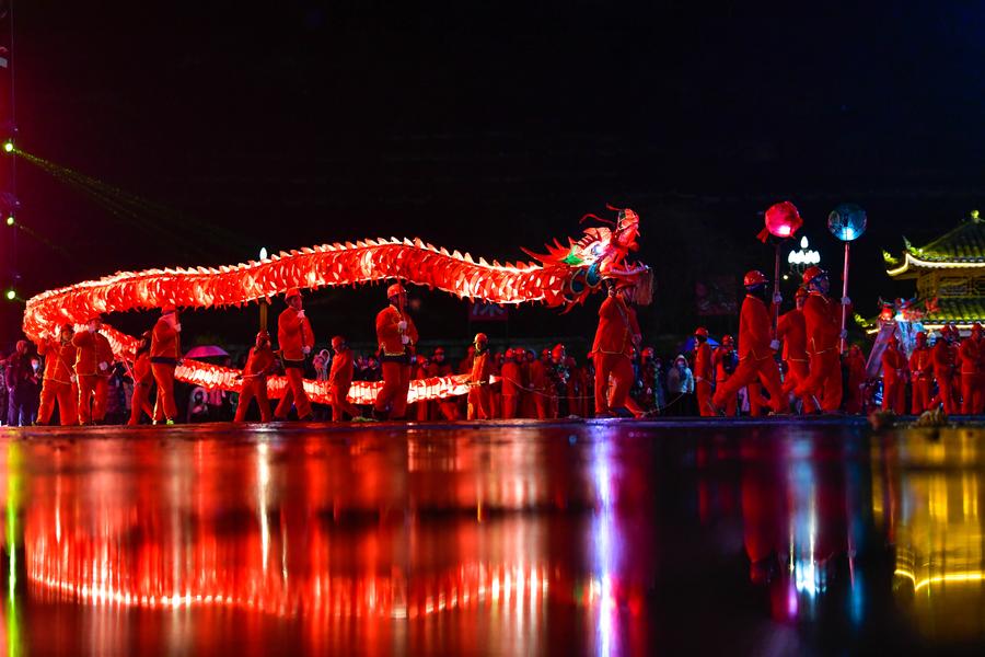 People attend a "Wulong Xuhua" show to celebrate the Lantern Festival in Taijiang County, southwest China's Guizhou Province, Feb. 23, 2024. (Xinhua/Yang Wenbin)