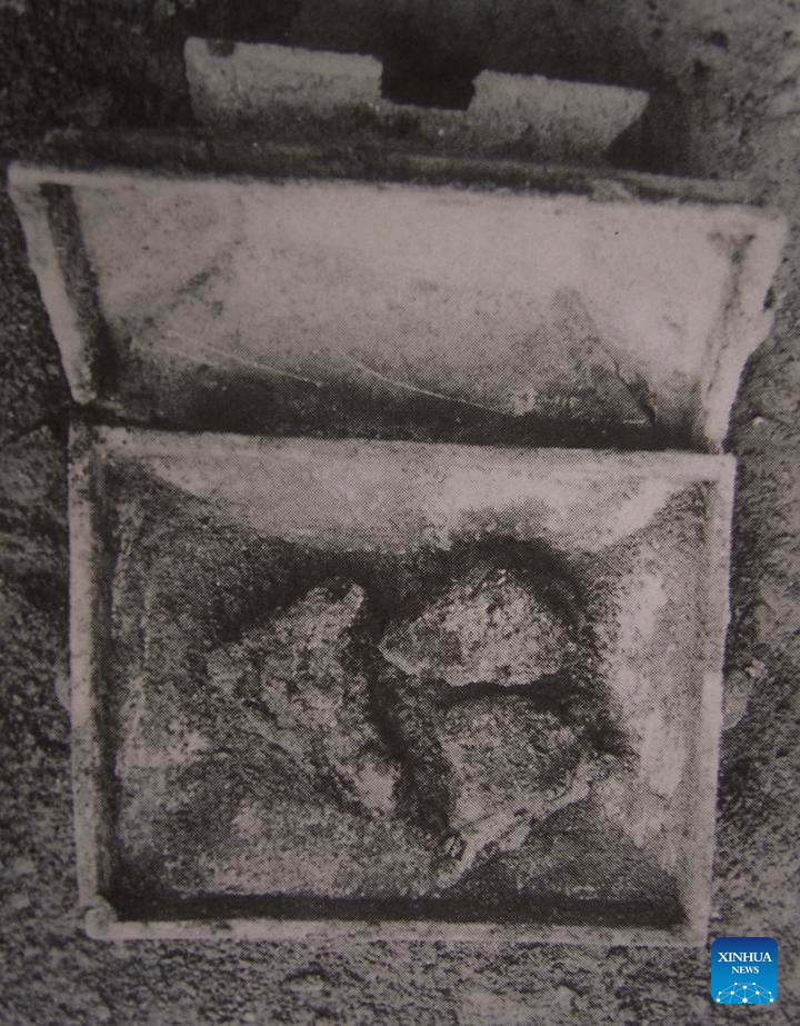 This undated file photo shows triangular food items resembling dumplings in a bronze container excavated from the tomb of a Xue monarch who ruled about 2,500 years ago, in Tengzhou, east China's Shandong Province. (Shandong Museum/Handout via Xinhua)