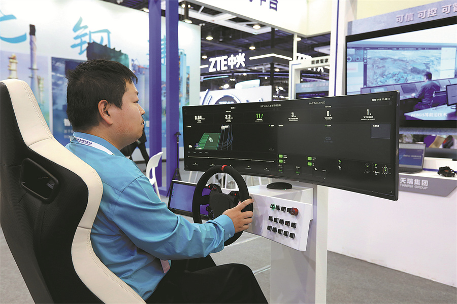 An employee from a participating enterprise demonstrates a pilotless remote cockpit during the 2023 Global Industrial Internet Conference in Shenyang, Liaoning province, on Oct 18. [Photo/Xinhua]