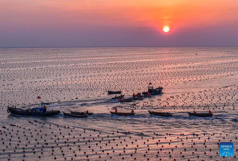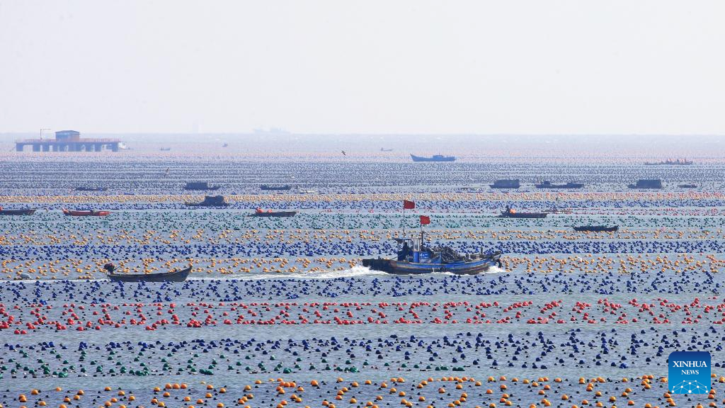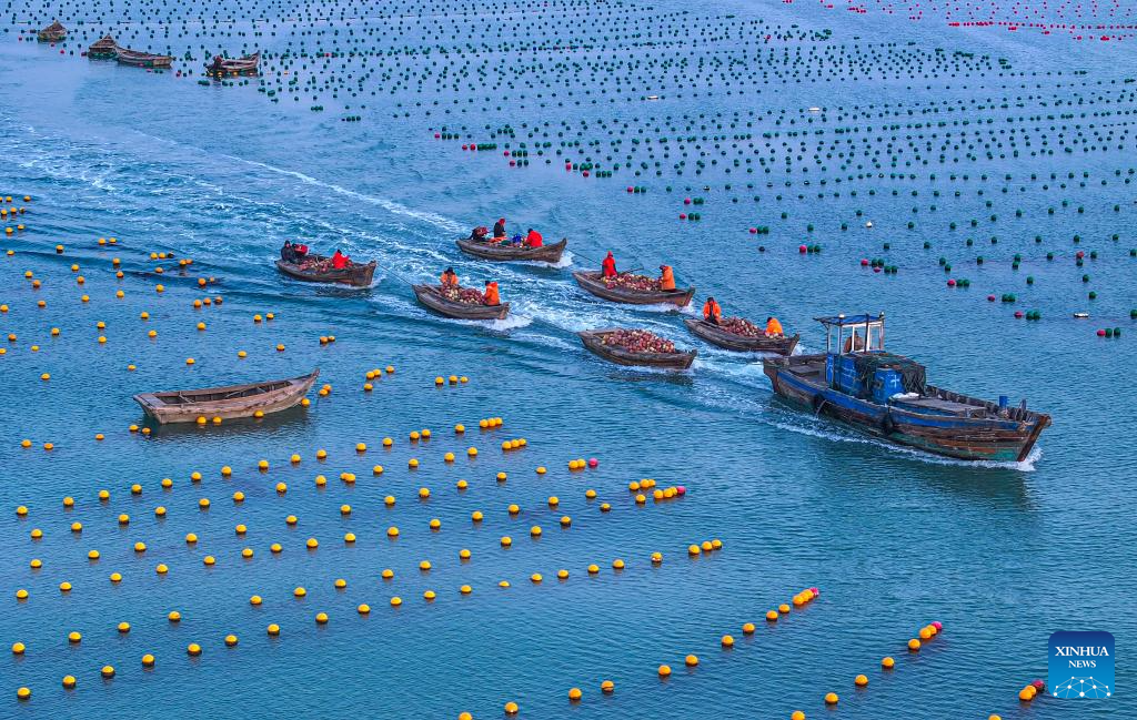 An aerial drone photo taken on Feb. 26, 2024 shows fishermen working at a marine ranch in Ailun Bay of Rongcheng City, east China's Shandong Province. (Photo by Wang Fudong/Xinhua)