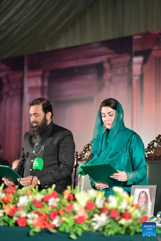 Maryam Nawaz Sharif (R) takes the oath as chief minister for Pakistan's eastern Punjab province in Lahore, Pakistan, Feb. 26, 2024. Maryam Nawaz Sharif, senior vice president of the Pakistan Muslim League-Nawaz party, was elected on Monday as the first female chief minister for Pakistan's eastern Punjab province, Speaker of the provincial assembly Malik Muhammad Ahmad announced. (Pakistan Muslim League-Nawaz/Handout via Xinhua)
