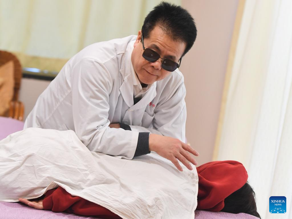 Wang Yongcheng demonstrates massage techniques for people with visual impairment at an instruction center of blind massage in Fuzhou, southeast China's Fujian Province, Feb. 6, 2024.(Xinhua/Jiang Kehong)