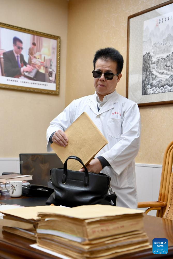 Wang Yongcheng arranges a Braille document on his suggestions at an instruction center of blind massage in Fuzhou, southeast China's Fujian Province, Feb. 6, 2024. (Xinhua/Jiang Kehong)