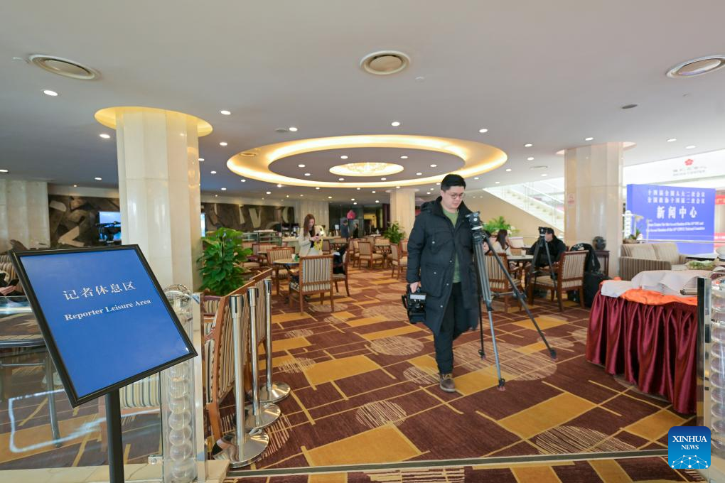 This photo taken on Feb. 27, 2024 shows a view of the press center for China's upcoming annual legislative and political consultative sessions in Beijing, capital of China. The press center opened Tuesday at the Media Center Hotel in Beijing. The second session of the 14th National People's Congress (NPC) and the second session of the 14th National Committee of the Chinese People's Political Consultative Conference (CPPCC) will open on March 5 and 4, respectively.(Xinhua/Li Xin)