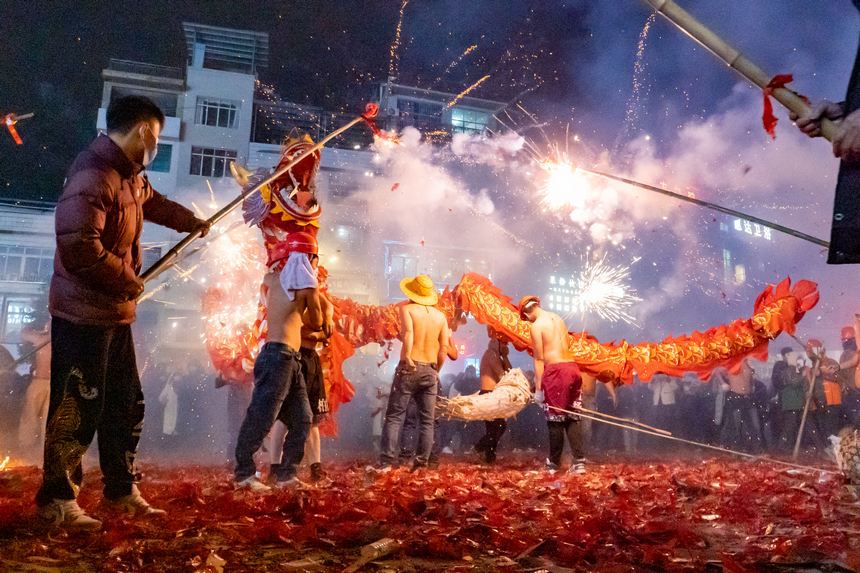 A time-honored tradition of the local Tujia ethnic group, the celebration takes place every year during the Lantern Festival. During the event, dragon dance teams brave the streets while spectators hurl firecrackers and fireworks at them. This exhilarating event creates a lively spectacle, earning the event its nickname, "Oriental Carnival." In 2021, this unique tradition was added to the expanded list of state-level intangible cultural heritage items.