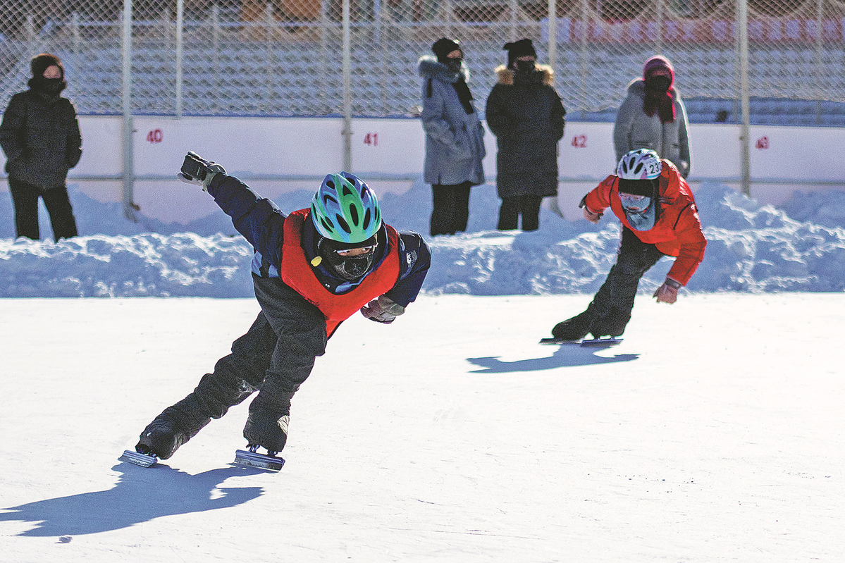 Children skate on the ice rink at the Heihe Fitness Center in Heilongjiang province on Jan 31. XIE JIANFEI/XINHUA