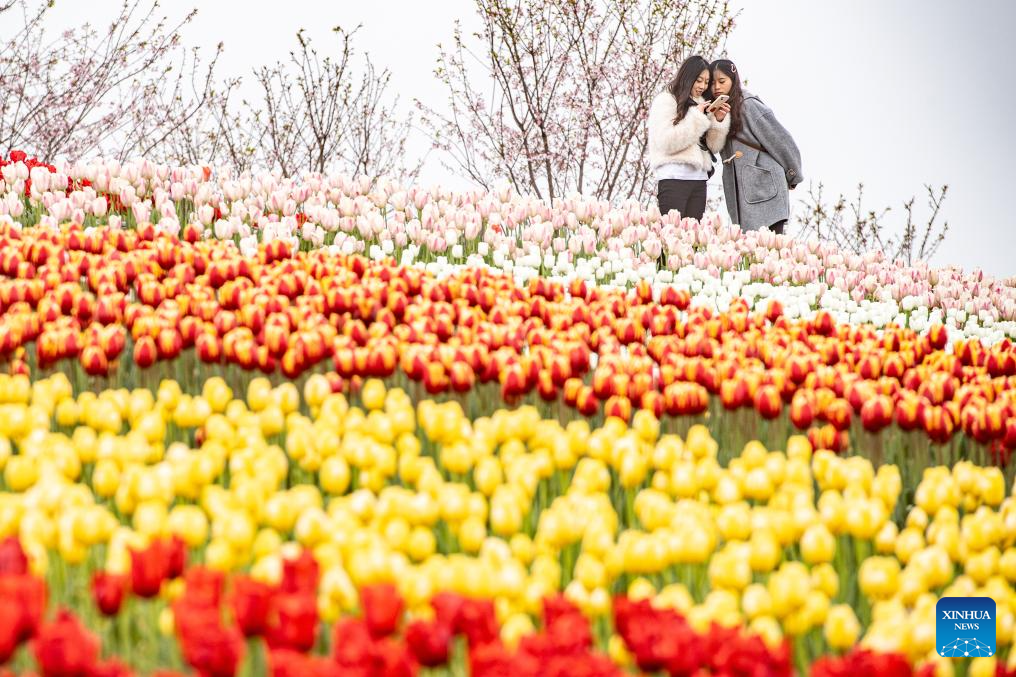 Visitors take photos of blooming tulips at a scenic area in southwest China's Chongqing, Feb. 27, 2024. (Xinhua/Tang Yi)