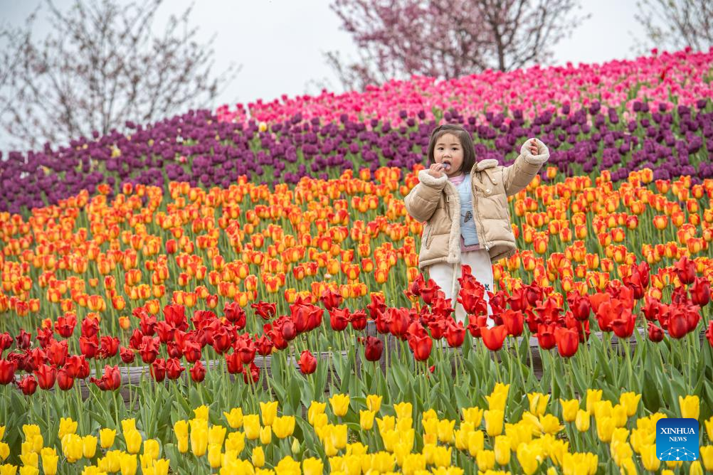 A girl plays among blooming tulips at a scenic area in southwest China's Chongqing, Feb. 27, 2024. (Xinhua/Tang Yi)