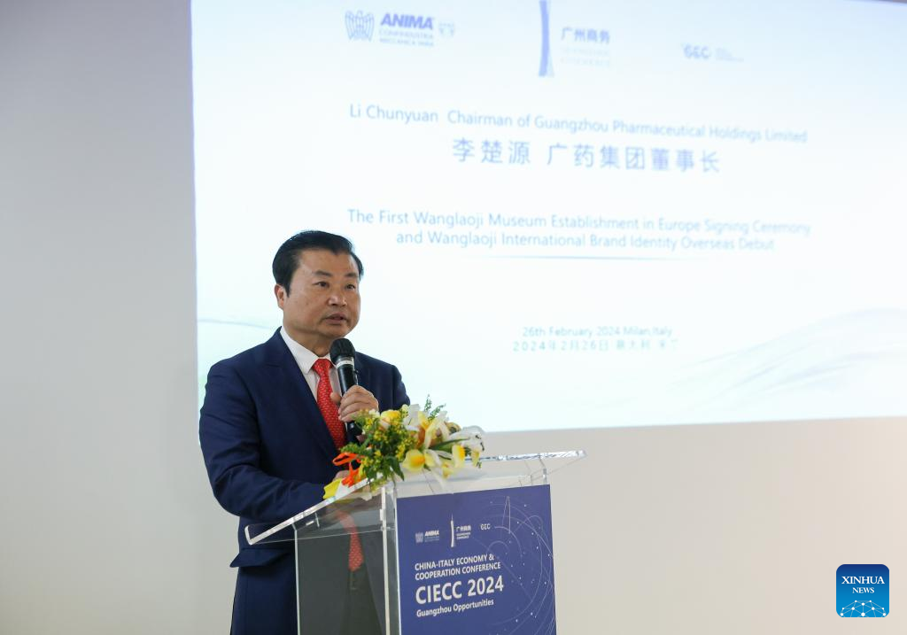 Li Chuyuan, chairman of Guangzhou Pharmaceutical Holdings Ltd., speaks at the debut press conference of WALOVI, a Chinese herbal tea brand, in Milan, Italy, on Feb. 26, 2024. A Chinese herbal tea maker is seeking to expand its presence in the international market with the debut of its brand name "WALOVI" in Milan on Monday and a planned museum of its products in Italy in the near future. Guangzhou Wanglaoji Health Industry Co., Ltd., based in south China's Guangdong Province, said the move is aimed at opening up the international market as well as spreading Chinese tea culture. (Xinhua/Li Jing)