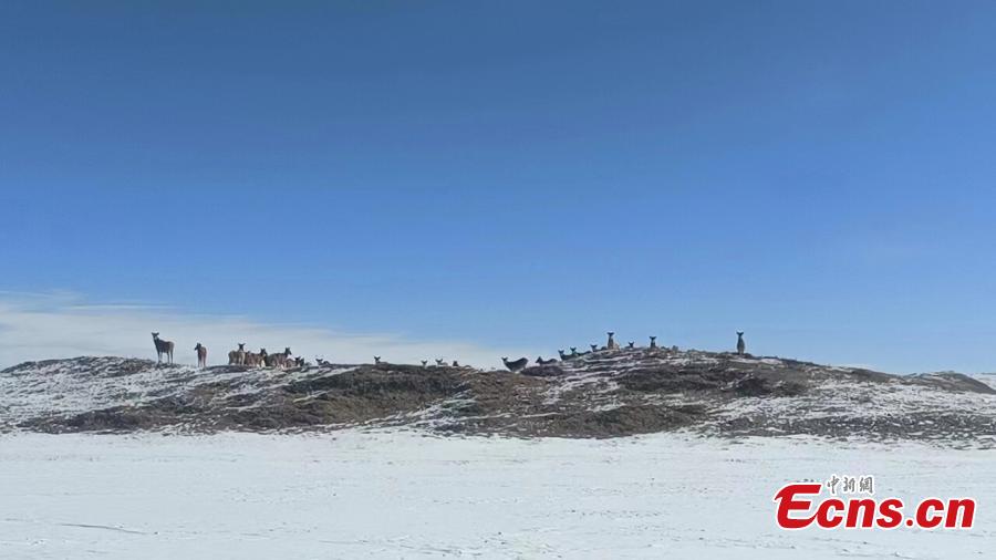 A herd of over 100 white-lipped deer, under China's first-class national protection, migrate on the frozen Yellow River in Sanjiangyuan National Park in northwest China's Qinghai Province. (Photo/China News Service)