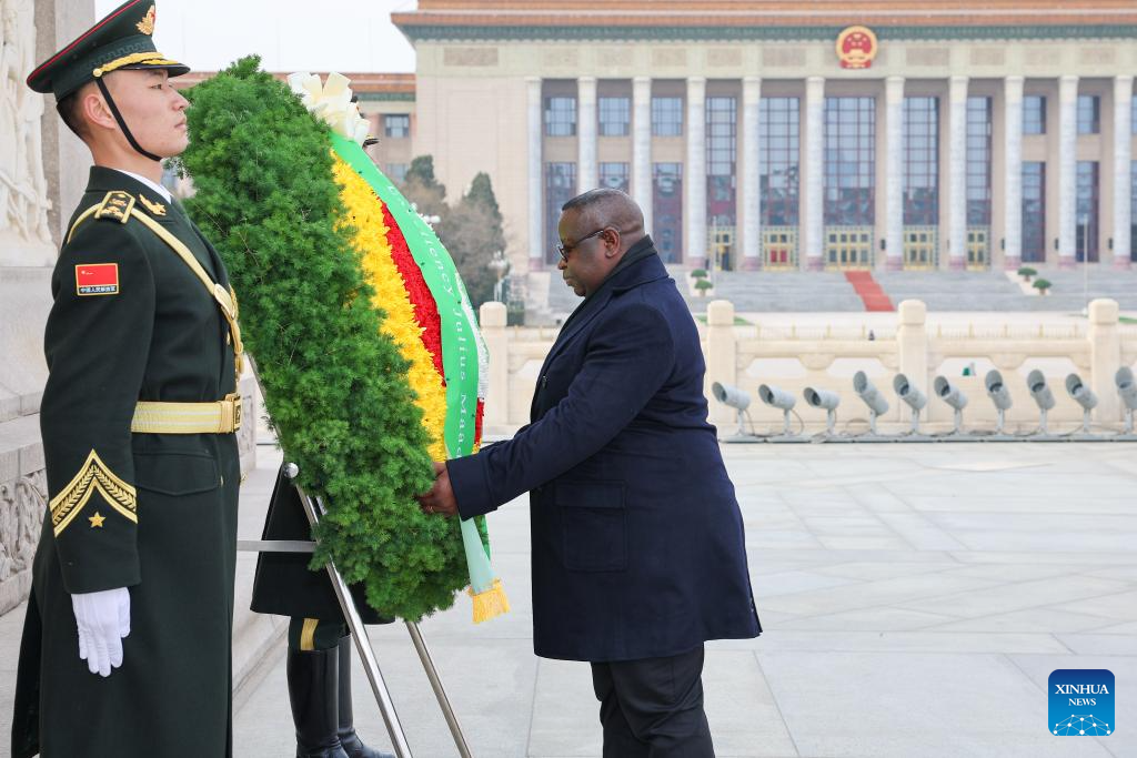 Sierra Leonean President Julius Maada Bio lays a wreath at the Monument to the People's Heroes on the Tian'anmen Square in Beijing, capital of China, Feb. 28, 2024. (Xinhua/Liu Bin)