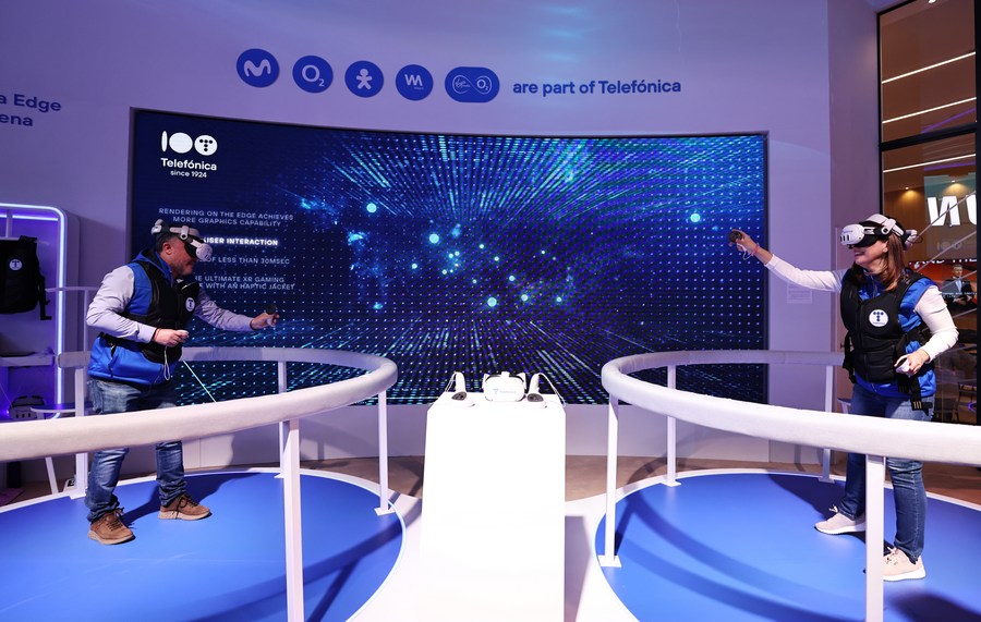 People try on Virtual Reality (VR) devices during the 2024 edition of the Mobile World Congress (MWC) in Barcelona, Spain, Feb. 26, 2024. (Xinhua/Gao Jing)