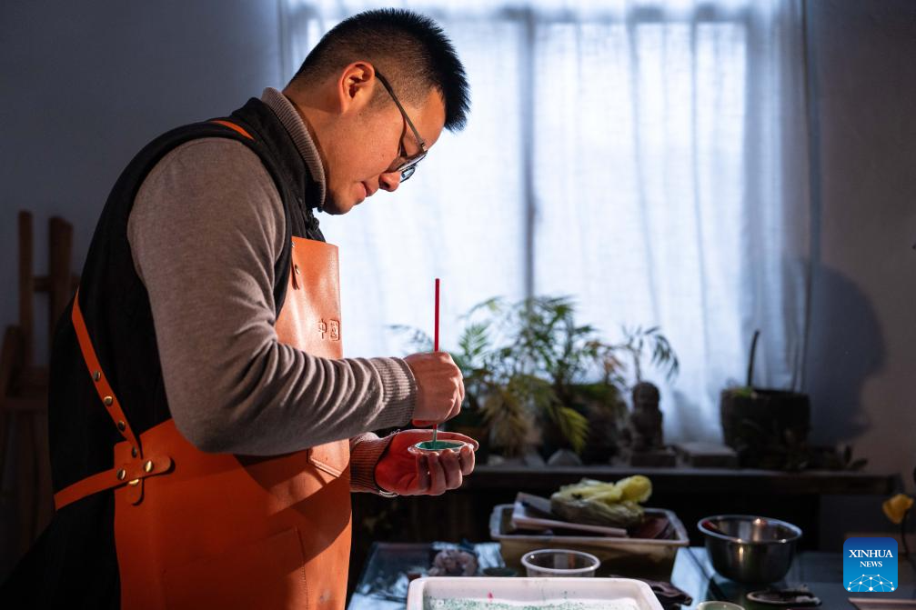 Hao Guanxiong makes an artwork at his studio in Changsha, central China's Hunan Province, Feb. 28. 2024. (Xinhua/Chen Sihan)
