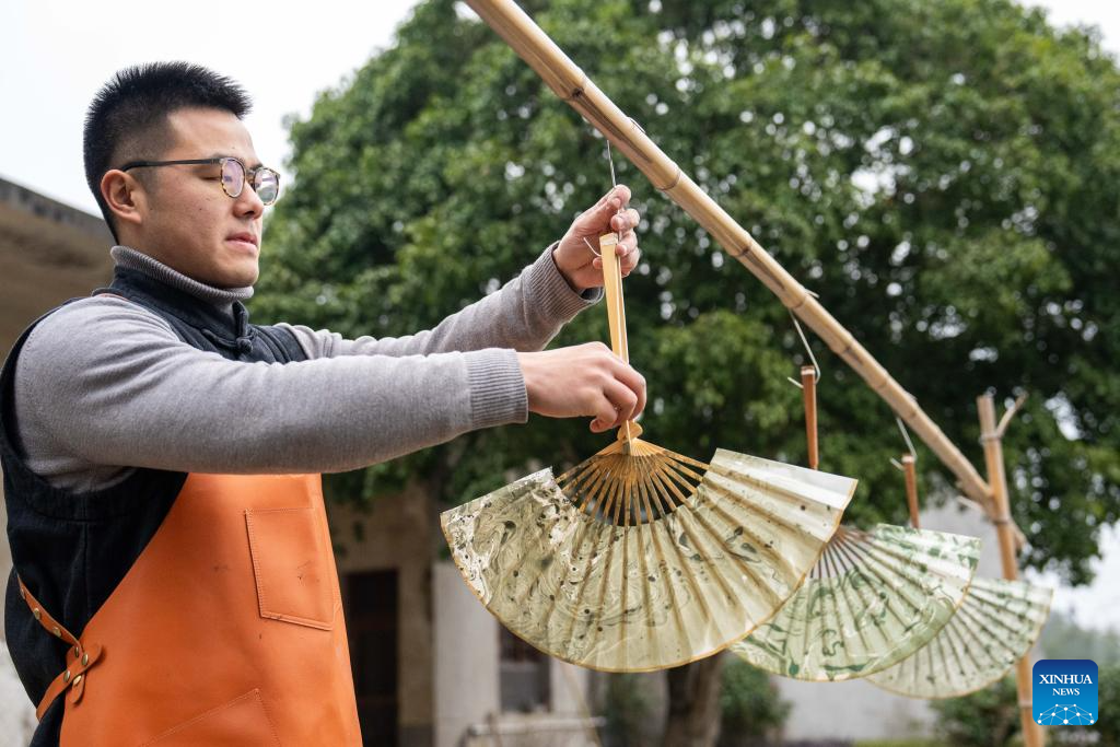 Hao Guanxiong dries lacquer coated fans at his studio in Changsha, central China's Hunan Province, Feb. 28. 2024. (Xinhua/Chen Sihan)