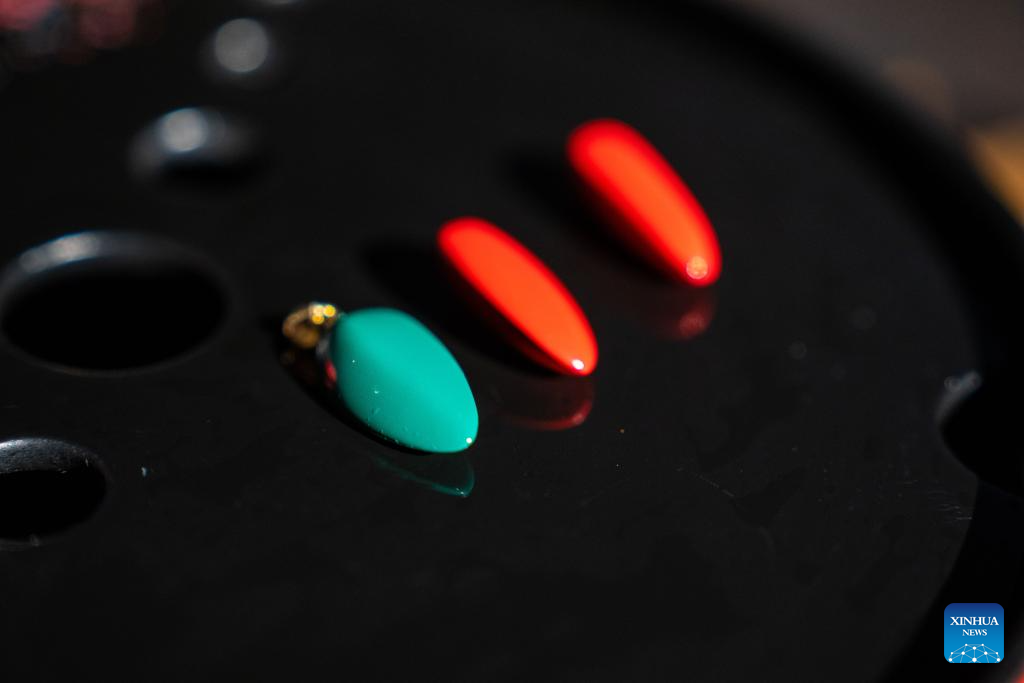 Melon-seed-shaped lacquer coated pendants are displayed at Hao Guanxiong's studio in Changsha, central China's Hunan Province, Feb. 28. 2024. (Xinhua/Chen Sihan)