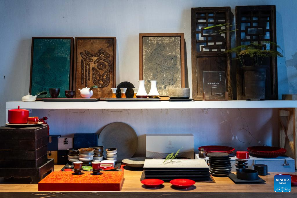 Lacquer coated tea sets are displayed at Hao Guanxiong's studio in Changsha, central China's Hunan Province, Feb. 28. 2024. (Xinhua/Chen Sihan)