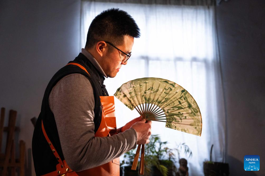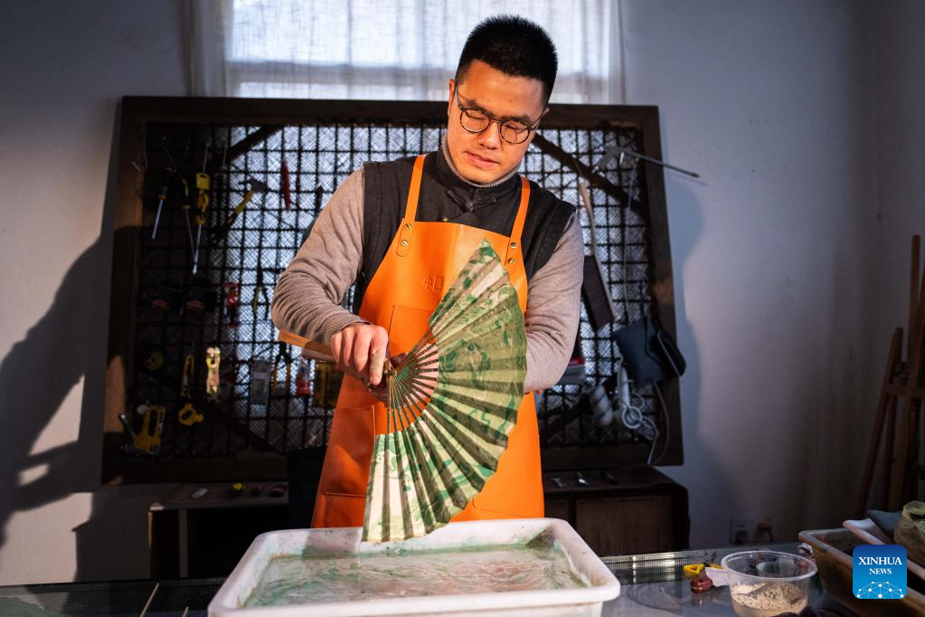 Hao Guanxiong makes lacquer coated fan at his studio in Changsha, central China's Hunan Province, Feb. 28. 2024. (Xinhua/Chen Sihan)