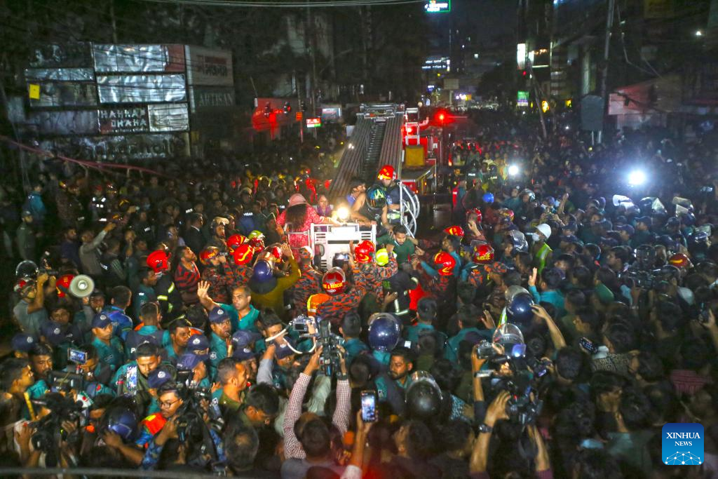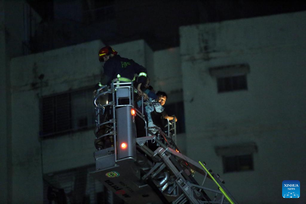 Firefighters conduct rescue work at the site of a building fire in Dhaka, Bangladesh, on Feb. 29, 2024. At least 43 people were killed Thursday night after a devastating fire tore through a high-rise building in the Bangladeshi capital of Dhaka. (Xinhua)