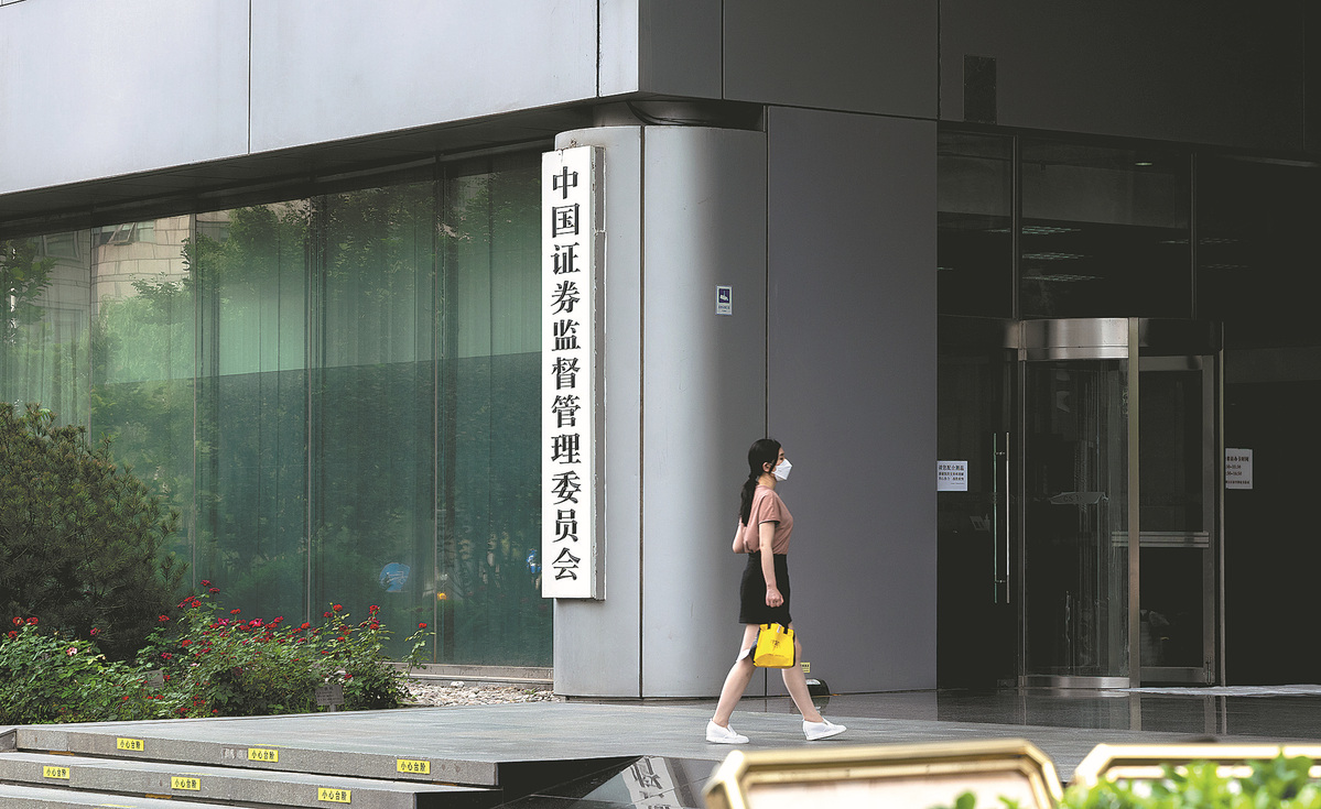 A pedestrian walks past the China Securities Regulatory Commission in Beijing. [CHINA DAILY]