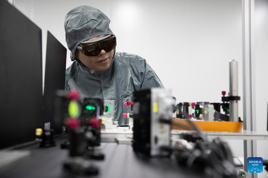 Yang Xiaojun checks experiment progress at a laboratory of MICROMACH in Xi'an, northwest China's Shaanxi Province, Jan. 17, 2024. (Xinhua/Jin Liwang)