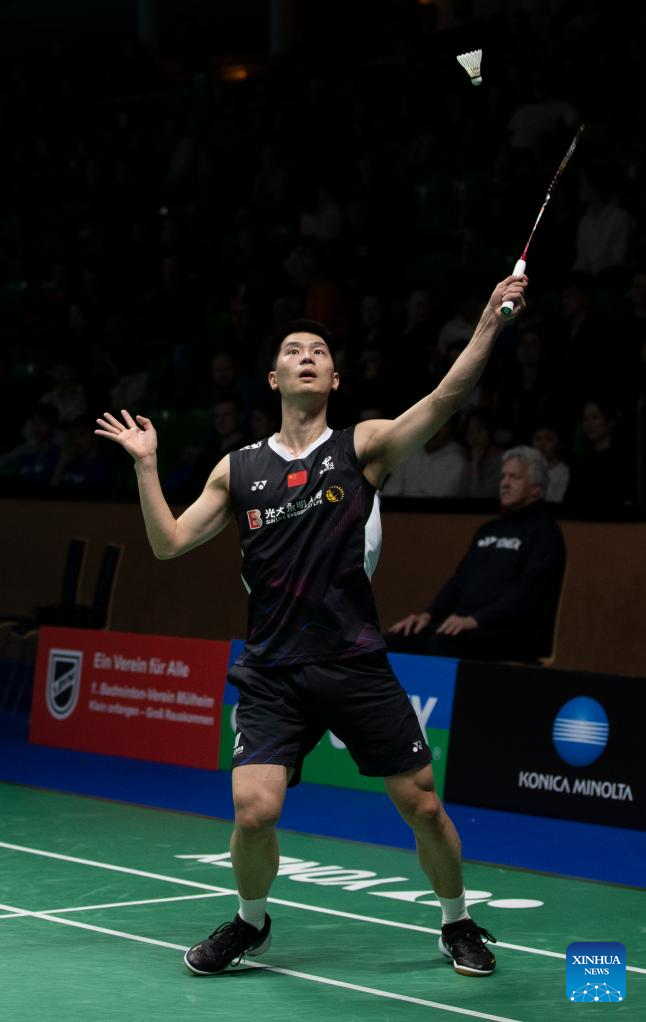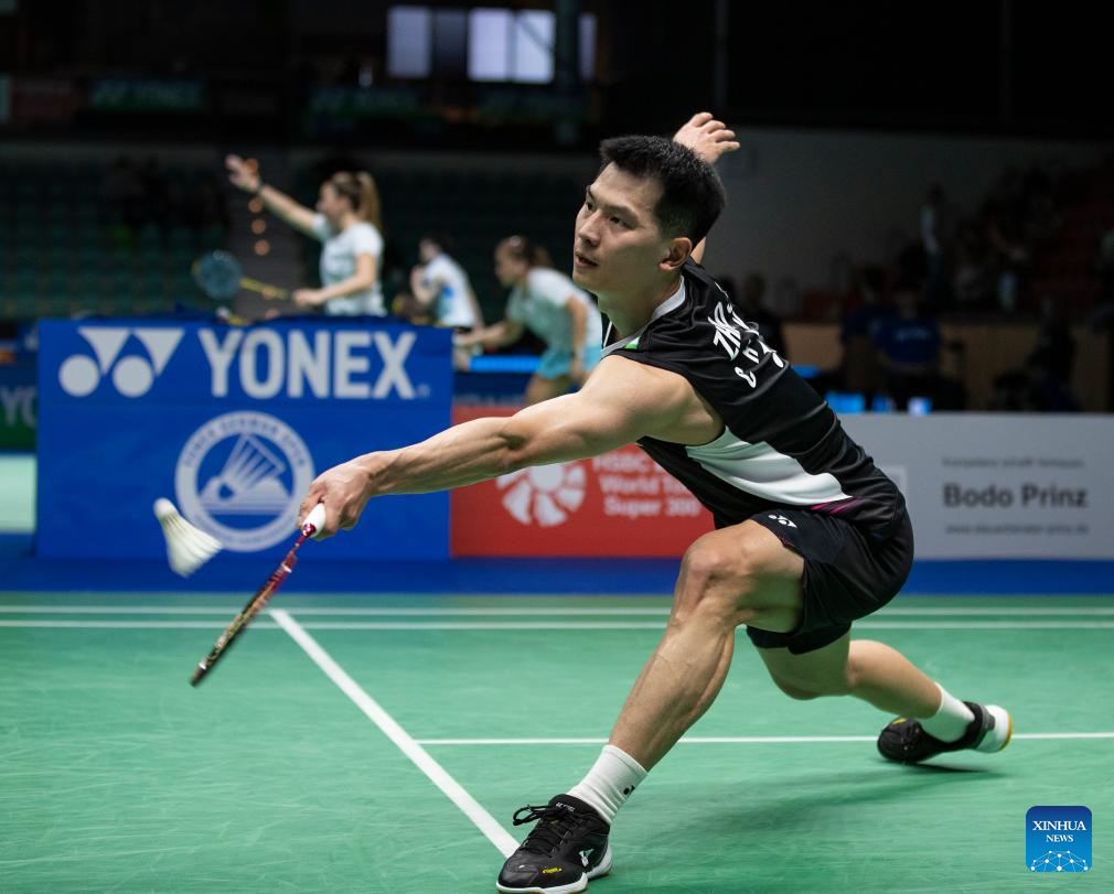Chou Tien Chen of Chinese Taipei returns the shuttlecock to Zhao Junpeng of China during the men's singles second round match at Yonex German Open 2024 badminton tournament in Muelheim, Germany, Feb. 29, 2024. (Xinhua/Zhang Fan)
