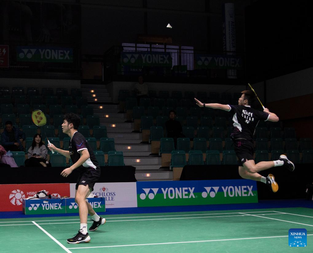 He Jiting (below, 2nd R)/Ren Xiangyu (below, 1st R) of China compete against Job Castillo/Luis Armando Montoya Navarro of Mexico during the men's doubles second round match at Yonex German Open 2024 badminton tournament in Muelheim, Germany, Feb 29, 2024. (Xinhua/Zhang Fan)