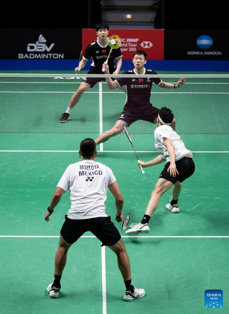 He Jiting/Ren Xiangyu (L) of China compete against Job Castillo/Luis Armando Montoya Navarro of Mexico during the men's doubles second round match at Yonex German Open 2024 badminton tournament in Muelheim, Germany, Feb 29, 2024. (Xinhua/Zhang Fan)