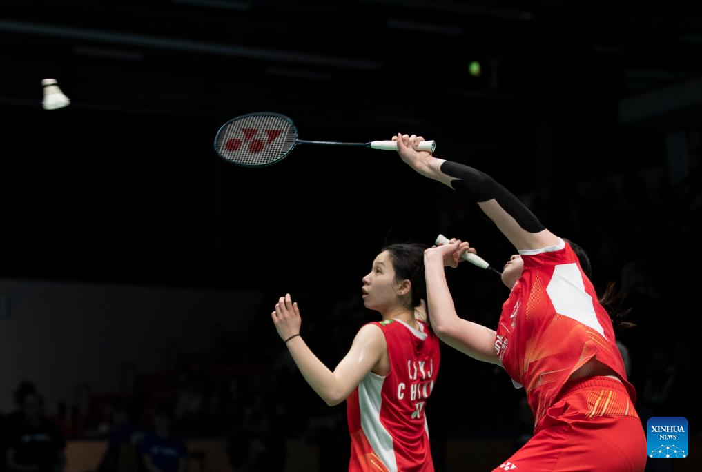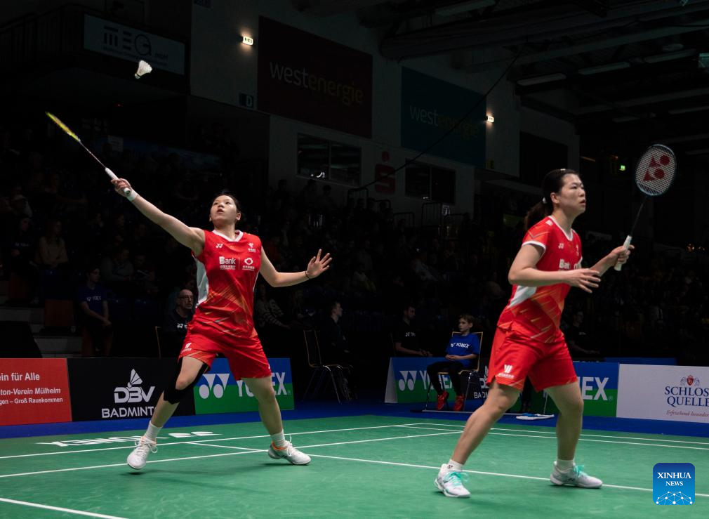 Li Yijing (L)/Luo Xumin of China compete against Francesca Corbett/Allison Lee of the United States during the women's doubles second round match at Yonex German Open 2024 badminton tournament in Muelheim, Germany, Feb 29, 2024. (Xinhua/Zhang Fan)