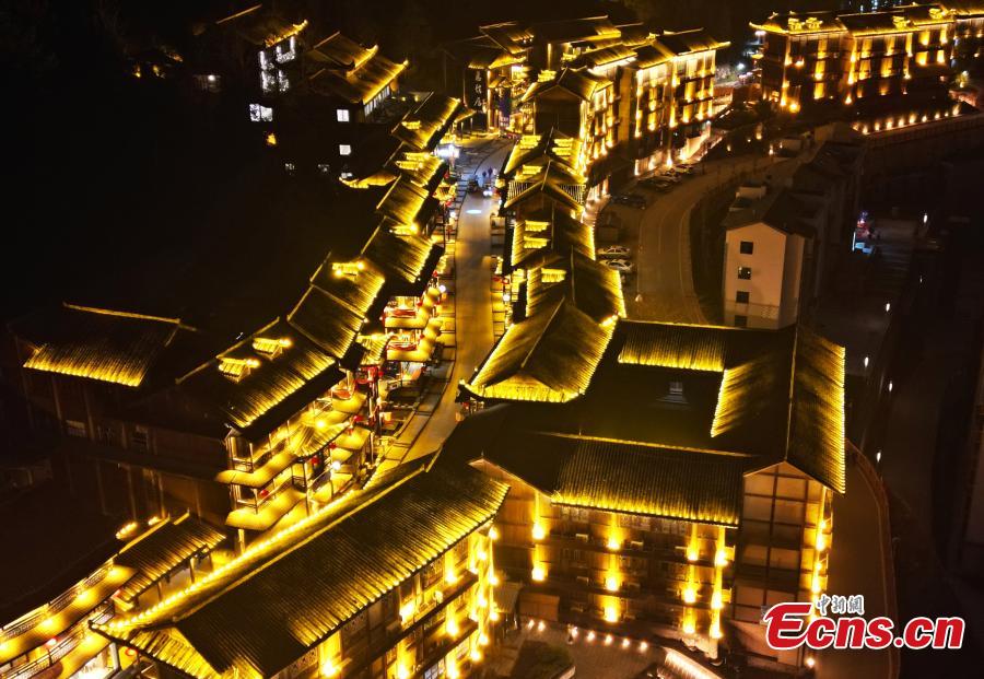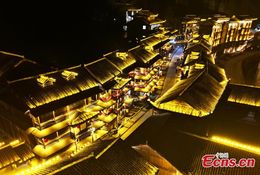 Youzhou ancient town is lit up at night, creating a dream-like scenery in Youyang Tujia and Miao Autonomous County, Chongqing, Feb. 29, 2024. (Photo: China News Service/Zhou Yi)