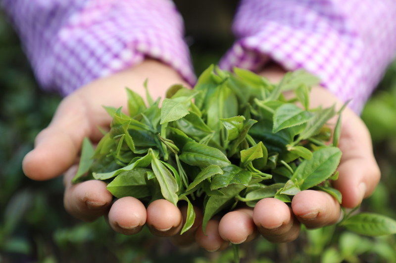 A farmer shows freshly harvested spring tea leaves at an eco-friendly tea plantation in Bajiao township, Longzhou county, south China's Guangxi Zhuang Autonomous Region. (Photo/Liang Yanyun)