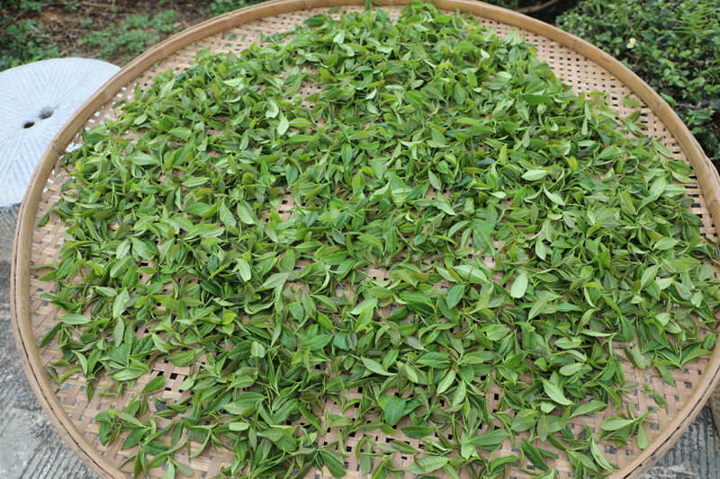Spring tea leaves are withered at an eco-friendly tea plantation in Bajiao township, Longzhou county, south China's Guangxi Zhuang Autonomous Region. (Photo/Liang Yanyun)