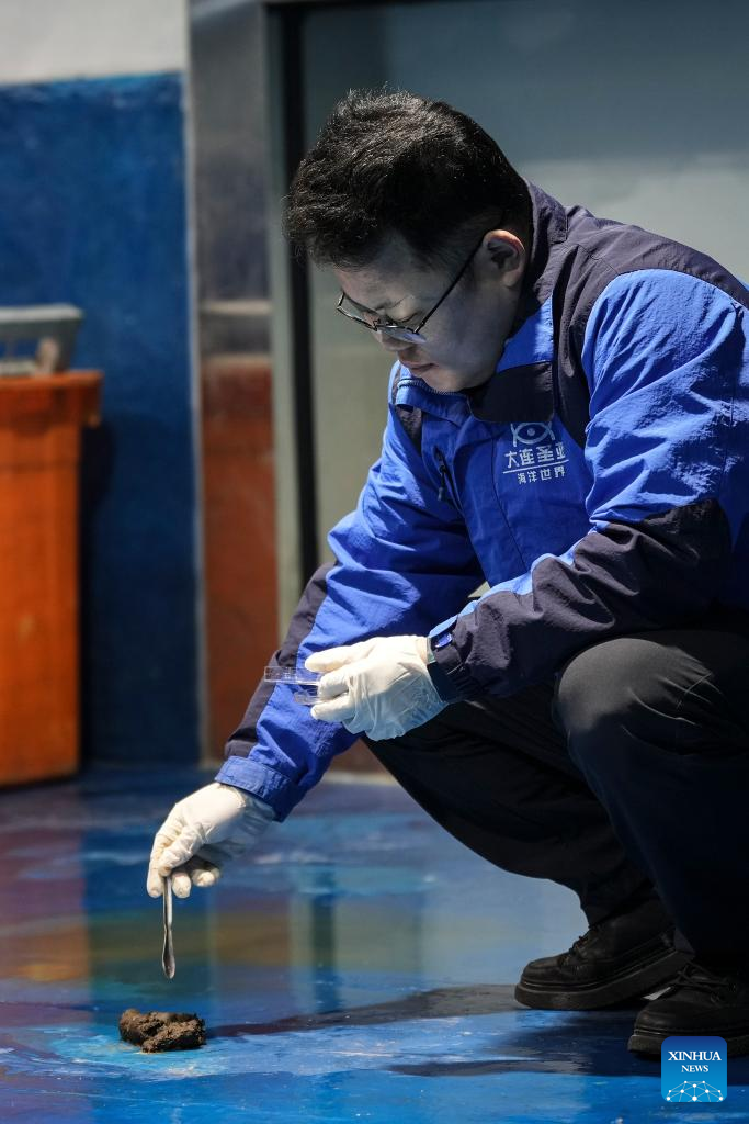 Dr. Luo Jun collects spotted seal dung samples at Dalian Sunasia seal breeding base in Dalian, northeast China's Liaoning Province, Feb. 28, 2024.
