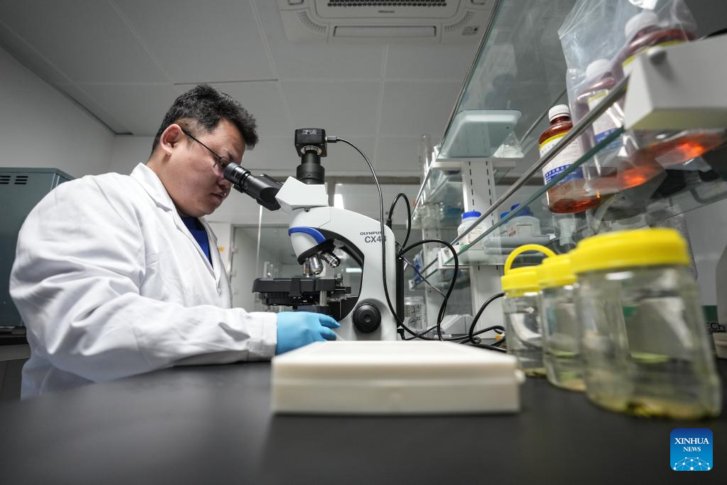 Dr. Luo Jun tests sea water samples at Dalian Sunasia Marine Biology Institute in Dalian, northeast China's Liaoning Province, Feb. 28, 2024. (Xinhua/Pan Yulong)