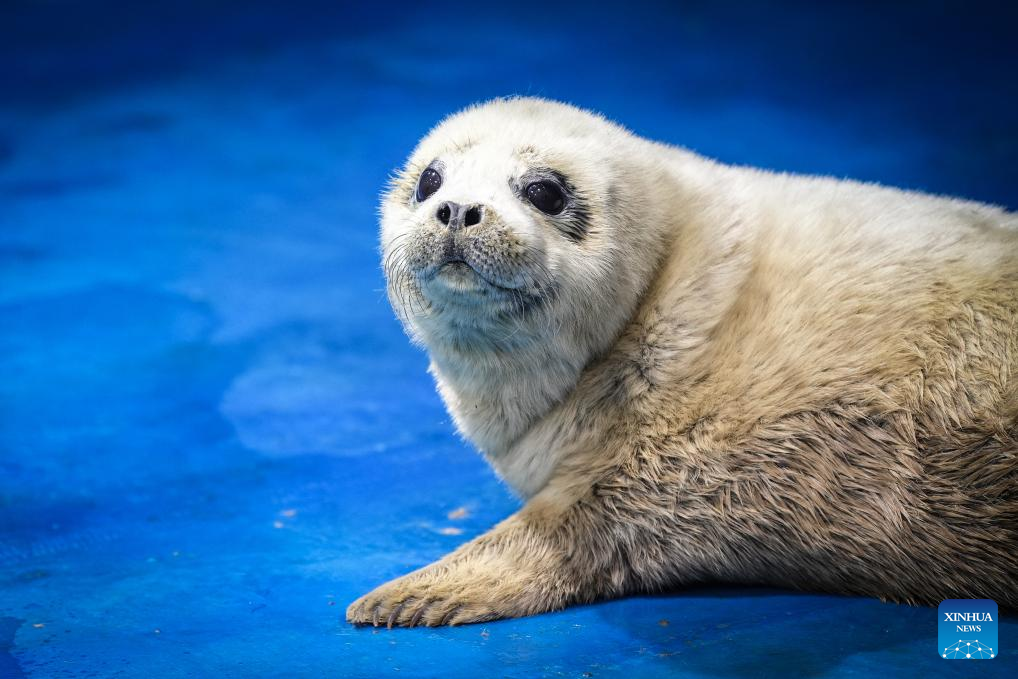 This photo taken on Feb. 28, 2024 shows a spotted seal pup born in 2024 at Dalian Sunasia seal breeding base in Dalian, northeast China's Liaoning Province. (Xinhua/Pan Yulong)