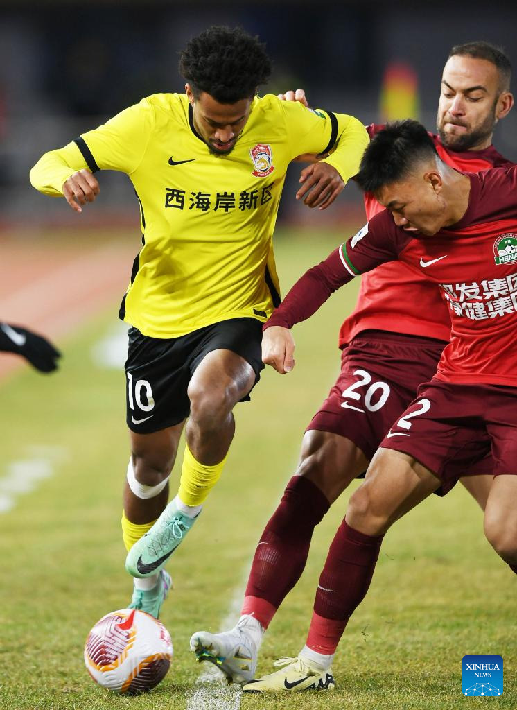 Nelson da Luz (L) of Qingdao West Coast breaks through during the first round match between Qingdao West Coast and Henan FC at the 2024 season Chinese Football Association Super League (CSL) in Qingdao, east China's Shandong Province, March 1, 2024. (Xinhua/Li Ziheng)