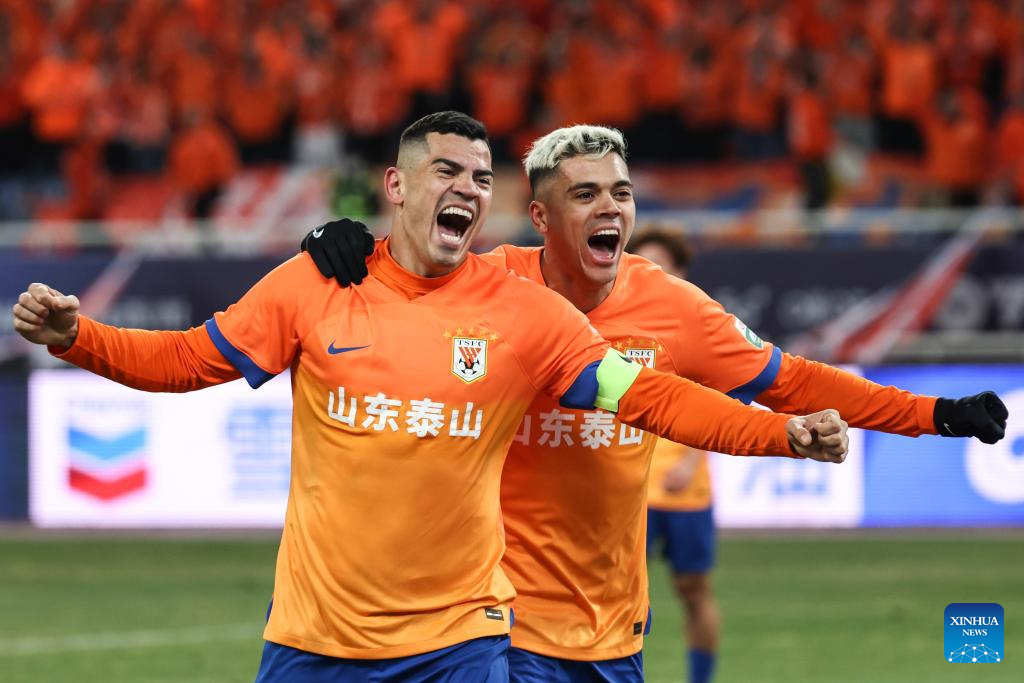 Jadson Cristiano Silva de Morais (L) and Matheus Pato of Shandong Taishan celebrate during the first round match between Shandong Taishan and Changchun Yatai at the 2024 season Chinese Football Association Super League (CSL) in Jinan, east China's Shandong Province, March 1, 2024. (Xinhua/Zhu Zheng)