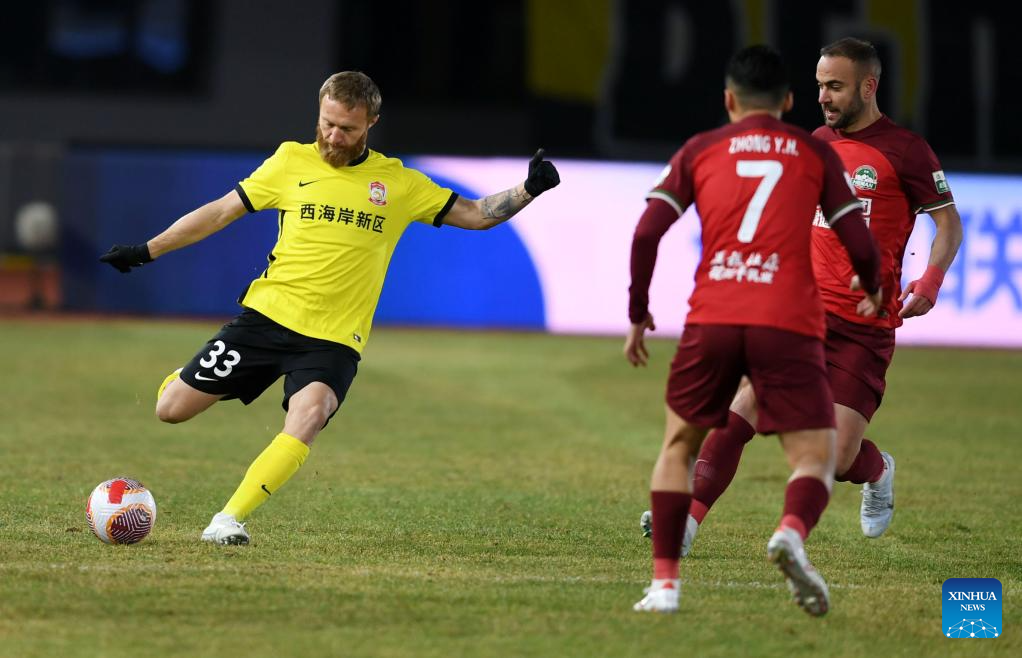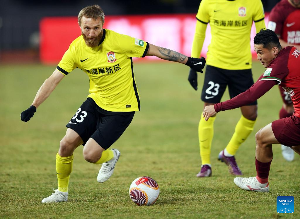 Varazdat Haroyan (L) of Qingdao West Coast competes during the first round match between Qingdao West Coast and Henan FC at the 2024 season Chinese Football Association Super League (CSL) in Qingdao, east China's Shandong Province, March 1, 2024. (Xinhua/Li Ziheng)