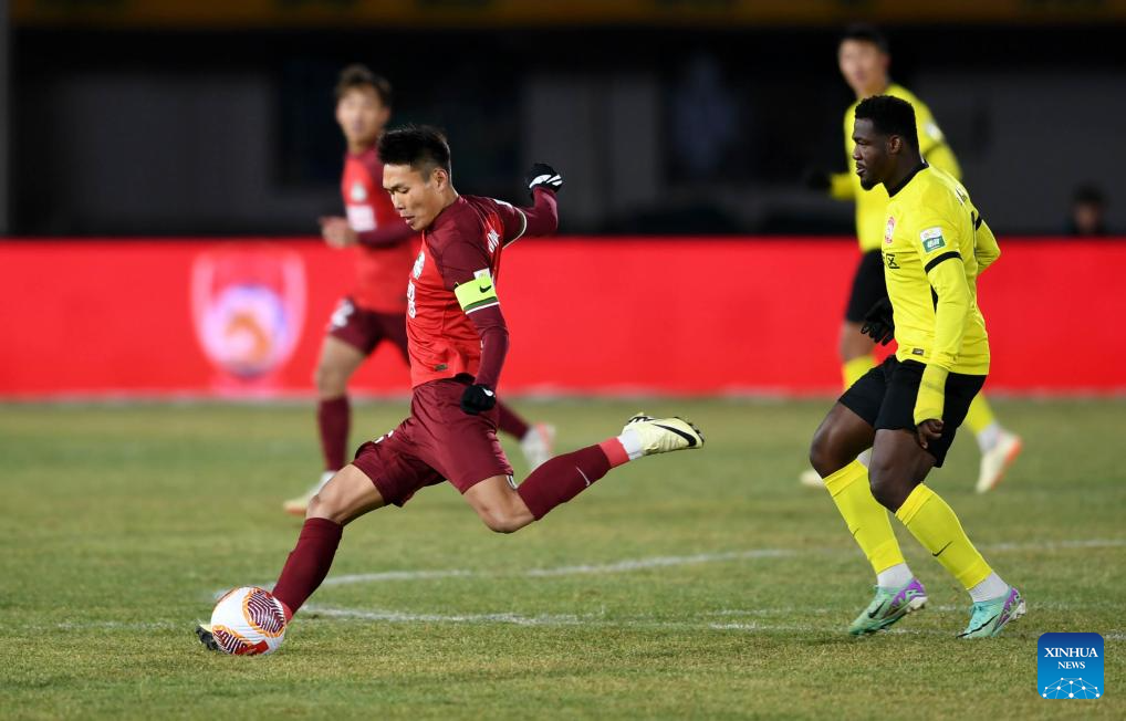 Wang Shangyuan (L) of Henan shoots during the first round match between Qingdao West Coast and Henan FC at the 2024 season Chinese Football Association Super League (CSL) in Qingdao, east China's Shandong Province, March 1, 2024. (Xinhua/Li Ziheng)