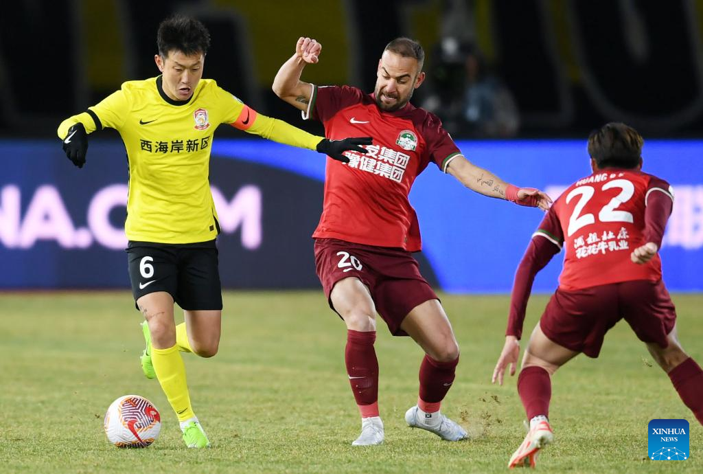 Nemanja Covic (C) of Henan competes during the first round match between Qingdao West Coast and Henan FC at the 2024 season Chinese Football Association Super League (CSL) in Qingdao, east China's Shandong Province, March 1, 2024. (Xinhua/Li Ziheng)